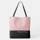 This lovely fashion forward tote bag shows the word "Maid of Honour" in white text colour over black with the upper tote bag in custom Dusty Rose Pink. Has plenty of room for personalised text. Graphics and text are on both sides of this tote bag. Black handle. Customise further or buy as shown.