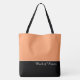 This lovely fashion forward tote bag shows the word "Maid of Honour" in white text colour over black with the upper tote bag in custom Cantaloupe. Has plenty of room for personalised text. Graphics and text are on both sides of this tote bag. Black handle. Customise further or buy as shown.