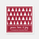 Host a festive holiday party with paper napkins featuring a white geometric tree pattern on a maroon background. On a burgundy band across the bottom, it reads, "peace, love, & joy" in a white script font above your name in a simple sans serif white font. Personalise it by adding a custom greeting, family name and/or the year in the sidebar.
