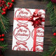 Chic, modern cursive script across a gorgeous red ribbon and bow reads MERRY CHRISTMAS in elegant cursive typography. A tied bow is super trendy for 2025 non photo holiday wrapping paper. Personalise with your family or business name in the centre of this gift wrap.