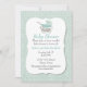 Elegant mint green and white baby shower invitation with a small white polka dot, on a mint green linen looking background. A white decorative text area has graphics of a pretty mint green baby buggy decorating the top. Personalise all the text for your baby event.