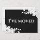 Chic Modern Black And White Floral Moving announcement card. Chic black background, decorated with delicate and modern sketch style white floral arrangement on the top right corner and bottom left corner. Chic font combination of elegant calligraphy and serif white typography.