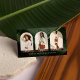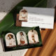 Elevate your brand with our modern and elegant boho-style business card template, featuring a tropical banana leaf background and three arch-shaped photo placeholders on the front for your own images. A woodgrain strip along the bottom of each arch provides space for a callout word and your website. The reverse side showcases a modern stripe with leaf, woodgrain, and sand textures, along with an arch-shaped photo for your portrait, plus name and contact details. Perfect for fashion designers, interior creatives, and stylish entrepreneurs, this fully customizable template combines boho charm with contemporary sophistication. Design and layout by ©Moodthology Papery