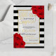 These chic and very stylish surprise birthday party acrylic invitations features an elegant faux gold foil frame on trendy black and white stripes with red roses and matching modern typography that is perfect for celebrations of any age. Easily personalise the design with your own wording and find matching party items at www.zazzle.com/invitation_republic.