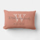 Chic Modern Monogram Family Name Cute Keepsake Lumbar Pillow. A personalised monogram initial and your family's last name and wedding date in script lettering on a salmon background. Makes a unique cute gift for newlyweds. Lovely for newly weds new life together or for your family room. Click personalise this template to customise it quickly and easily. Ships Worldwide fast.