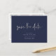 Chic and modern signature script in faux silver Save the Date postcards, DIY background in navy blue. Copyright © 2016-2019 Bombino Designs.