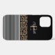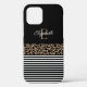 An elegant black leopard animal print and black and white striped monogram Iphone 12 cell phone case. Stylish and chic! Add your name and initial. Designed for you by Blackberry Boulevard.