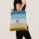 Modern and chic, this bag features an ocean, beach or sea-inspired colours of faux leather stripe patterns of deep blue, silver white grey and sunny yellow and a customisable monogram.