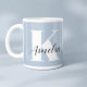 Personalised light blue mug featuring your monogram initial in modern large white typography and your name in a stylish signature script.