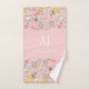 Trendy monogrammed bath towel set featuring pretty floral borders and your name and monogram initials over a pastel blush pink background. ++++++++ Can be a nice treat for your own bathroom or a housewarming gift for a friend.