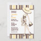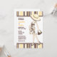 A clean and simple, gender neutral baby shower invite featuring yellow, brown & white striped details and a stylish Mother to Be dressed in chic paisley maternity wear & hat.