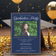 A chic custom graduation party invitation in elegant navy blue, gold, and white for a high school, college, or university from the class of 2025. Customise with your school name and graduating class under the lovely calligraphy and your senior photo for a great personalised graduate invite card. Elegant cursive script for your graduating class event.