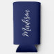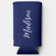 A chic personalized navy blue monogram seltzer can cooler for a guy or girl who loves simple, handwritten gifts. Beautiful white cursive script down the side spelling out your name in elegant script.