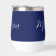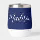 A chic navy blue personalised monogram wine tumbler for a girl or guy who loves simple, handwritten gifts. Beautiful white cursive script down the side spelling out your name in modern typography.