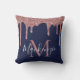 Chic Navy Blue and Rose Gold Glitter Drips Monogram Throw Pillow with fashion faux blush pink/rose gold glitter drips on a chic navy blue background with your custom monogram and name. You're dripping in luxury, so show it off! Please contact us at cedarandstring@gmail.com if you need assistance with the design or matching products.