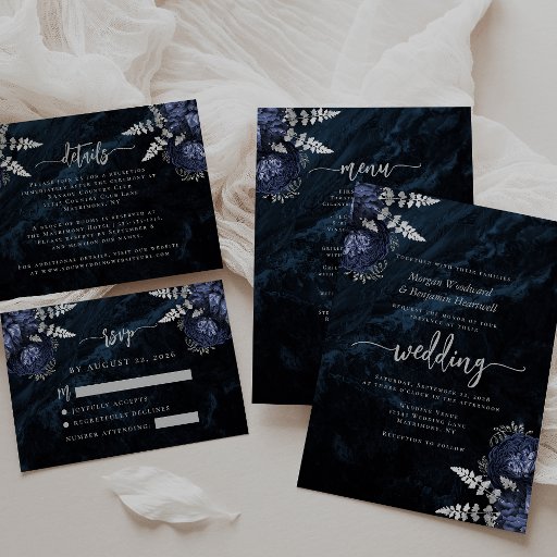 Navy Blue Silver Floral Script Wedding SuiteDesigned by Akhates Designs