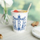 These chic pagoda monogram cups are perfect to use for entertaining and make an excellent hostess gift. The pagoda design and the monogram are in a navy blue on white.