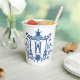 These chic pagoda monogram cups are perfect to use for entertaining and make an excellent hostess gift. The pagoda design and the monogram are in a navy blue on white.