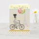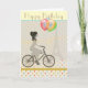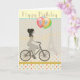 Chic and modern Greeting card to personalise with your own text for Birthdays or any occasion. Elegant girl riding a bicycle with the Eiffel Towel in the background and balloons tied to the handle bars. Image bordered by multi-coloured polka dot pattern.