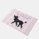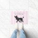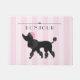 This chic, girly design shows an elegant grey poodle complete with beret, on a soft pink French striped background. The doormat says "bonjour" in a Parisian style black text. Some graphics by 1Everything Nice at Mygrafico.