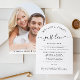 Elegant arch-shaped elopement or private wedding announcement and casual reception invitation featuring "Nothing Fancy Just Love" in a blend of simple lettering and a chic script with swashes, your personalised marriage announcement and reception invitation, and your names in a signature-like script. On the back, add your photo and your first names and wedding or reception dates joined together by a heart.