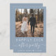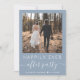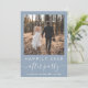 Elegant dusty blue elopement or private wedding announcement and all-in-one wedding reception invitation. The front features your photo, "Happily Ever After Party" in a blend of simple white typography and a chic white script with swashes, and your names and wedding or reception date joined together by a heart. On the back, personalise your details, input your wedding website address to create a QR code for guests to scan to see your wedding photos, all of the details and to RSVP online, and add your names in a signature-like script.