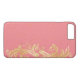 Lovely iPhone 7 Plus case done in a salmon pink, with graphics of small gold tone polka dots and a golden flourish, up the right side of the case. Customise to add any text you want to this pretty case.