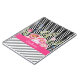 A chic pink floral notebook with a trendy black and white chevron pattern background on the top and grey and white diagonal stripes on the bottom. Make it uniquely yours by adding your name to the girly hot pink stripe.