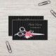 Chic pink and black hairdresser business cards featuring a pair of elegant FAUX silver hair cutting scissors embellished with beautiful pink flowers with a subtle black on black vertical striped pattern background. Personalise this stylish hair salon business card design by adding the name of the hairstylist or beautician. Flat printed image, NOT metallic or reflective.