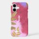 A modern chic iPhone case, tailor-made for those who adore a hint of opulence. A graceful shade of pink, adorned with a shimmering, sparkling texture, sets the stage for elegance. The left side boasts an enchanting arrangement of golden leaves, adding an extra layer of allure. Personalisation takes centre stage with your name, artfully scripted in cursive, alongside your initial letter presented in a sleek, modern sans-serif font. This case is not just an accessory; it's a reflection of your unique style.