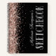 Stylish minimalist sketchbook featuring a black background with white custom name template in a feminine calligraphy script. A rose gold pink glitter border adds a girly touch.