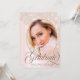 Invite your friends and family to your college graduation celebration in style with this chic photo graduation announcement and virtual party invitation. This elegant template design features a photo for you to change to your own framed in faux blush pink dripping glitter. Below your photo it reads "Graduate" in dusty rose script typography with your name, college and year to personalise. The back of the card has all your virtual party details to customise accented by a faux gold graduation cap. Designed by Susan Coffey.