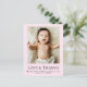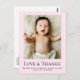 Celebrate your new arrival with this sweet pink newborn thank-you postcard. Featuring a full baby photo, “Love & Thanks” typography, birth details, and space for a heartfelt message, it’s a perfect way to thank loved ones for their gifts, kindness, and support. Soft pastel pink and clean serif text make it ideal for baby girls, birth announcements, and modern minimalist keepsake stationery.