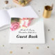 Chic pink rose flower bouquet wedding guest book. Romantic floral background image. Elegant script typography template with custom date and personalised names. Beautiful photograph. Upload your own picture optionally. Part of matching collection set with fancy stationery and floral decorations.