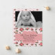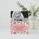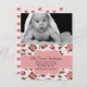 Elegant custom photo baby birth announcement done in a pink rose pattern, with graphics of a ivory lace edge, at the top. A custom baby photo decorates the top, of the flat card, with a pink decorative band text area, across the floral pattern, with black text ready to personalise, with your baby's birth information. Sweet and stylish way to announce the arrival of your baby girl, to friends and family.