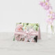 All purpose wedding note card with a chic photograph of pink and white roses. Graphics of a pale pink satin looking ribbon and bow stretches across the middle of the card, with a white lacy doily accent under the bow. Pale pink background on the inside of the card, with black script text ready to personalise. Lovely as thank you cards after the wedding and note cards to your bridesmaids.