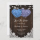 Romantic rustic purple and blue wedding save the date cards featuring hydrangea hearts against a barn wood background adorned with white floral lace and string lights. Matching items available.