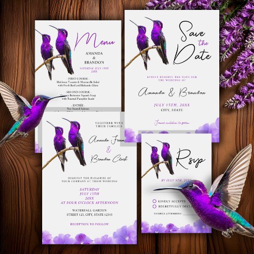 A vibrant wedding design featuring a pair of vivid purple hummingbirds perched on a branch, complemented by soft purple petals along the bottom edge. A lively and romantic layout for spring or garden-themed celebrations.