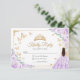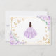 Purple lilac, gold and white Quinceanera RSVP reply card. Features brunette girl in ball gown dress, script font, gold butterflies, roses and tiara. Perfect for an elegant princess style glam celebration. Personalize with your own details.