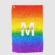 Play your golf game in style with this custom glitter and glam LGBT golf towel and show your support. The chic rainbow striped design includes shades of red, orange, yellow, green, blue and purple faux glitter with a monogram initial in white and name in modern black script for you to personalise. Show your pride!