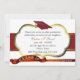 Elegant graduation party invitation done in white and red, with gold tone accents. A decorative gold edged white text area has golden yellow and black text ready to personalise. White background, with graphics of a red and gold ribbon across the middle, a red graduate's mortarboard cap, on the top, and a red and gold banner, on the bottom. Great looking graduation party invitation.