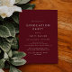 This chic red graduation party invitation is perfect for a modern outdoor party. The simple design features classic dark burgundy red and white typography with a rustic boho feel. Customisable in any colour.
