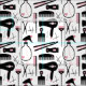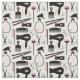 Hair stylist fabric in a chic retro design with hair salon tools in black, pink, and white with cute little hearts.