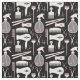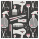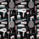 Hair stylist fabric in a chic retro design with hair salon tools in white and pink with cute little hearts against a black background.