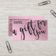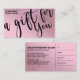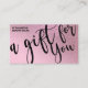 This is the perfect gift certificate business card for a trendy, stylish, girly, and modern businesswoman. This design features a simple black handwritten brush script typography on a faux printed sparkly rose pink glitter and blush pink ombre gradient glamourous and chic background. It's the perfect way to allow your customers to buy a gift for their family and friends and at the same time promote your business.