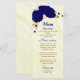 beautiful royal blue flowers and gold leaves elegant wedding menu.