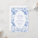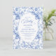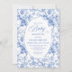 Create a timeless first impression with this baby shower invitation featuring elegant French toile de jouy roses in refined shades of navy blue, royal blue, dusty blue, and deep blue, inspired by classic chinoiserie floral design. This sophisticated style blends heritage elegance with modern charm, making it perfect for a memorable baby shower celebration.