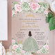 This chic Quinceañera acrylic invitation features a quince girl dressed in a lovely sage green dress, beautiful baby pink, sage green floral and soft greenery foliage. Personalise it with your details easily and quickly, simply press the Edit Using Design Tool button to further re-arrange and format the style and placement of the text. Also great for Sweet 16 and other occasions! (c) The Happy Cat Studio