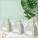 Gorgeous wedding favour box featuring a trendy sage green background with text in golden taupe set inside a soft white overlay and thin white border.