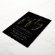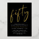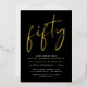 Chic black 50th birthday party invitation featuring "fifty" in a stylish script and your name in elegant serif typography, all rendered in your choice of genuine gold, silver or rose gold foil, and the party details in simple, modern white lettering.